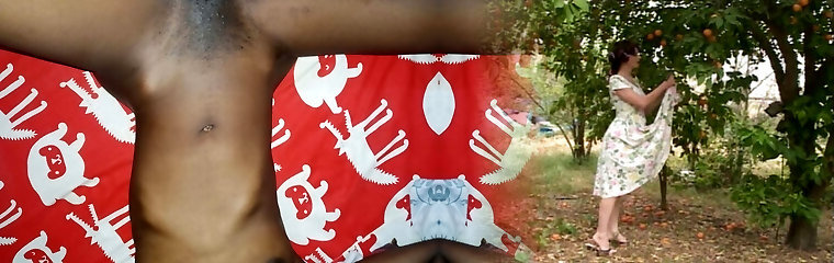 Dark-hued twins take off their clothes and position in the garden