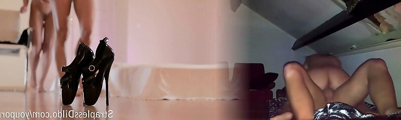 Curvaceous blonde slut in high heels is playing with her dildo, while sucking a dark-hued guy’s cock