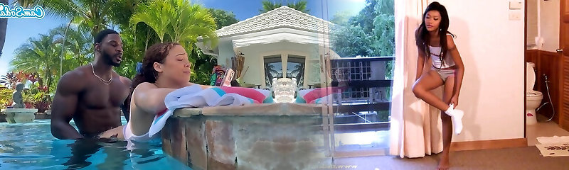 Jenna Starr having fun while blowing a dark-hued cock in the pool