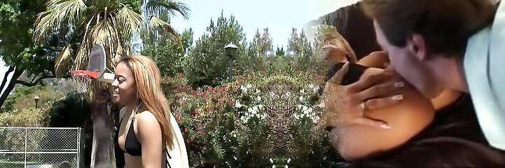 Sexy dark-haired girl in black bikini takes a big cock in pussy and ss
