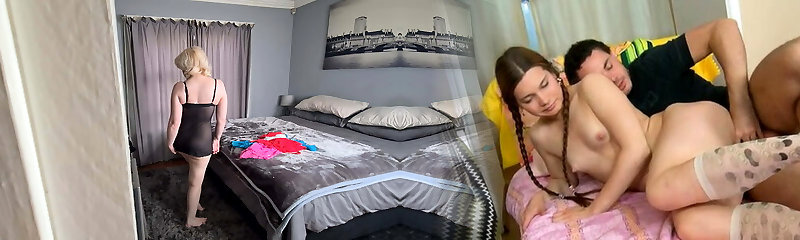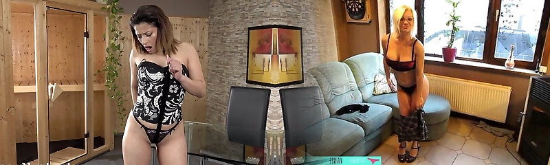 Peeping Tom watching mature blonde trying on different sexy lingerie outfits