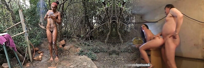 Dark inked desi slut taking a shower in the woods at a nude resort