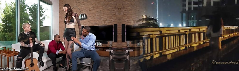 Rocker's wife turns him into a cuckold by shagging two big black cocks.