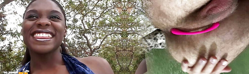 Ebony bi-atch in shorts gets cum in gullet after deepthroating cock outdoor