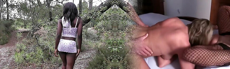 Unexperienced ebony babe in white lingerie stripping in nature